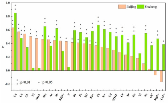 The contribution of water-soluble elements to OP is important, and it can induce the production of ROS [11]. In Beijing, there is a strong correlation between Cu (r = 0.63) and the generation of OP. Co and Ni have a moderate correlation with the OP. These elements may come from vehicle exhaust and brake wear [40]. In Gucheng, Cu, Pb, Mn, and Sb had strong correlations (r = 0.85, r = 0.67, r = 0.65, r = 0.62, respectively) with the OP. Ba, Fe, Cd, Sn, Zn, and Cr show moderate correlations with the OP (r > 0.5). Previous studies have shown that Cu, Pb, Fe, and Zn come from vehicle exhaust and industrial activities [41]. Mn, Sb, Ba, Cd, Sn, and Cr may originate from industrial activities and coal combustion [40]. Hence, industrial activities, vehicle exhaust, and coal combustion may be the main contributing sources to the OP in Gucheng.