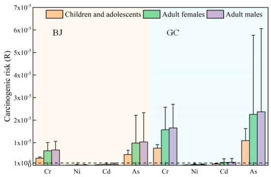 Noncarcinogenic risk calculations were performed for Cu, Zn, Pb, and Mn in the samples collected in Beijing and Gucheng. The risk assessment value of each element was calculated according to Equations (2)–(5). Carcinogenic risk assessment calculations were performed for Cr, Ni, Cd, and As. The results are shown in Figure 12 and Figure 13. Figure 12 shows that for all populations, the noncarcinogenic risk values of Pb and Mn were high, and in Beijing, the HQ values of Pb and Mn for children and adolescents, adult females, and adult males were (5.73 ± 3.37) × 10−3, (7.13 ± 4.18) × 10−3, (7.49 ± 4.39) × 10−3, (7.91 ± 3.57) × 10−3, (9.82 ± 4.43) × 10−3, and (1.03 ± 0.47) × 10−3, respectively. In Gucheng, the HQ values of Pb were higher than those in Beijing, at (1.48 ± 1.11) × 10−2, (1.84 ± 1.38) × 10−2, and (1.93 ± 1.45) × 10−2, respectively. The HQ values of Cu and Zn at both locations were less than 5 × 10−3. However, the HQ values of the noncarcinogenic risk factors are all less than 1. Therefore, the noncarcinogenic risks of Cu, Zn, Pb, and Mn are negligible.