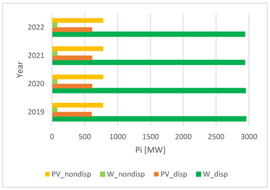 The total power for wind totals up to 3000 MW, whereas the dispatchable PV-installed unit power is up to 612 MW (as in Figure 8). The non-dispatchable PV-installed unit power is even higher, around 780 MW. Therefore, no significant investment took place during the last 3–4 years in RES in Romania.