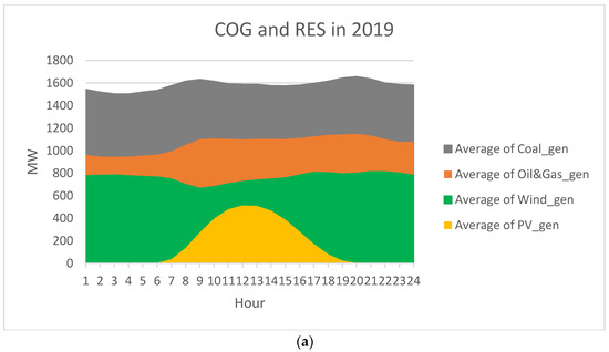 In order to analyze the potential of replacement of COG in the Romanian power system, we analyzed the hourly curves during 2019–2022. For the entire interval, COG follows the load curve adjusting the output according to the peak and off-peak hours, whereas PV and wind do not follow the load curve. The wind generation is rather constant, but for the PV generation, the bell curve is displayed. Furthermore, we noticed that wind generation is about 30% of the installed power (27.63%), whereas PV generation at noon can reach 92% of the installed power—Pi (as in Figure 9).