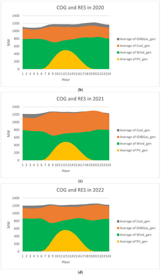 Another aspect can be noticed from Figure 10, namely that the coal coverage (the dark grey area) significantly decreased over the years. It was slightly compensated by the oil and gas coverage. Moreover, the total COG coverage decreased from 2646 MW in 2019 to 2396 MW in 2022.