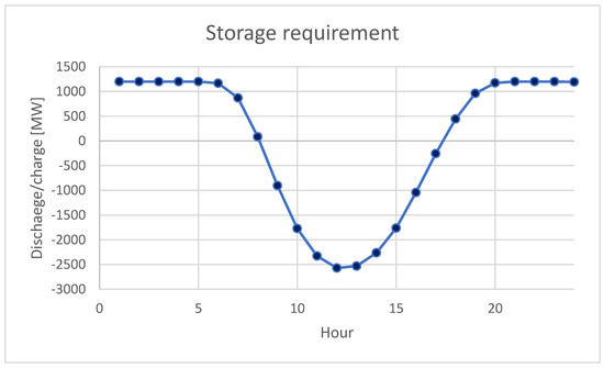In the second scenario, if the installed power in WPPs would be 4342.5 MW, the generated power from WPPs can be around 1200 MW; therefore, the storage requirement is depicted in Figure 11. The hourly storage requirements for night hours would be 1200 MW that together with 1200 from WPPs could lead to the replacement of 2400 MW generated now by COG. However, the required capacity of the battery systems is very high and very costly in this scenario. Thus, the total required capacity to replace 2400 MW of COG is above 15,000 MW.