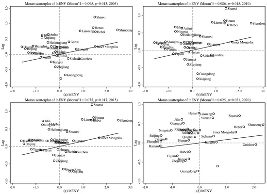 Before performing spatial econometric analysis, a spatial dependence test is required. The Moran scatters plot is a commonly used method for testing spatial dependence. We analyzed the spatial characteristics of environmental pollution in 2005 (Figure 2a), 2010 (Figure 2b), 2015 (Figure 2c), and 2020 (Figure 2d) using Moran scatter plots. The Moran index has been decreasing over the years, all are greater than 0.02, and the p-value is less than 0.05, indicating that the Moran’s I index is significant at the 5% level, and the ecological environment pollution of various provinces has a significant positive correlation in China.
