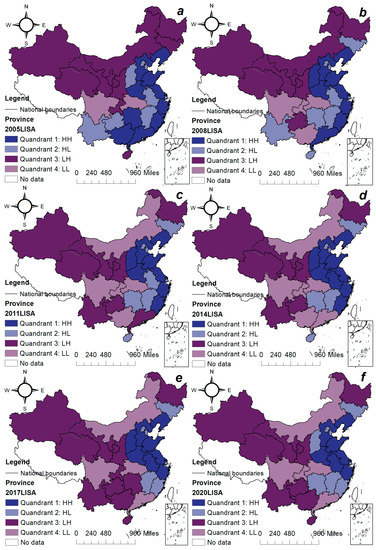 The Moran scatter chart is divided into four quadrants: The first quadrant indicates that provinces with higher environmental pollution are surrounded by provinces with higher pollution; the second quadrant indicates that provinces with lower environmental pollution are surrounded by provinces with higher pollution. The third quadrant indicates that provinces with lower environmental pollution are surrounded by provinces with lower pollution. The fourth quadrant indicates that provinces with higher environmental pollution are surrounded by provinces with lower pollution. The Moran index values are 0.095, 0.086, 0.075, and 0.025 in Figure 2, respectively, indicating that environmental pollution has significant positive spatial agglomeration characteristics; that is, high-polluted areas are surrounded by high-polluted areas, and low-polluted areas are surrounded by low-polluted areas. In order to show the environmental pollution status of each province more intuitively, Figure 3 shows the provinces corresponding to each of the four scatter diagrams above.