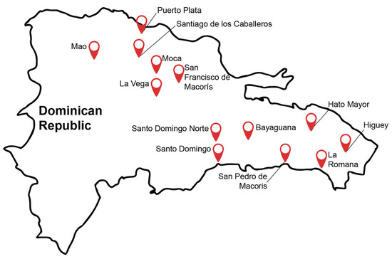 Samples were collected from raw meat (beef, pork, and broiler chickens [poultry]), feces from the corresponding food-producing animals, water for animal consumption, and animal feed. These samples were obtained from different locations around the country, such as Bayaguana, Hato Mayor, Higuey, La Romana, La Vega, Mao, Moca, Puerto Plata, San Francisco de Macoris, San Pedro de Macoris, Santiago de los Caballeros, Santo Domingo, and Santo Domingo Norte (Figure 1). Sampling sites and required authorizations to visit the farms were procured with the help of the Ministry of Agriculture in the DR. Meat samples were purchased from supermarkets and small butcher shops, placed into sterile bags, and transported the same day under refrigeration for further testing. Fecal samples from beef cattle and swine consisted of rectal specimens collected by government veterinarians using sterile palpation gloves and placed into sterile cups. Poultry litter was sampled using sterile pre-moistened boot swabs (Envirobootie™, Hardy Diagnostics). Two individuals wore boot swabs and walked around the poultry pen for 5 min. Each boot swab (left and right foot) was placed into separate sterile bags and treated as an independent sample. Water samples were obtained from animal waterers from farming operation facilities (beef cattle, swine, or poultry) and placed into sterile cups. Animal feed was obtained either from open containers at the farms or warehouses supplying pig farms and poultry houses. Beef cattle feed samples were limited to only one farm. All samples were labeled accordingly (date, type of sample, animal origin, location, and name of farm/market/shop) and transported the same day in coolers to the official testing microbiology laboratory affiliated with the Ministry of Agriculture in Santo Domingo.