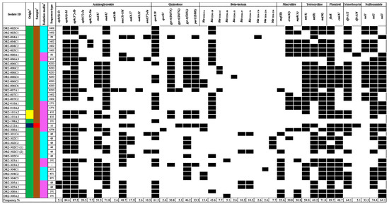 Distribution of AMR determinants on mcr-positive isolates for aminoglycosides, quinolones, beta-lactams, macrolides, tetracyclines, phenicol, trimethoprim, and sulfonamides. Black cells and white cells indicate the presence and absence of genes in the bacterial genome, respectively. For origin 1, the colors navy blue, yellow, and green, represent beef cattle, chicken, and swine, respectively. For sample 2, the colors brown and red represent feces and meat, respectively. For isolation media 3, the colors pink and light blue represent VRBG0 and XLT4/BGS, respectively.