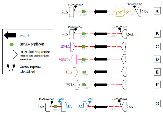 Diagrams of the genetic variation of the mcr-1 and IncX4 harboring contigs. An IncX4 plasmid replicon, mcr-1, and two partial IS26 with direct repeats (TCACACAG) were identified in variation (A–G). The IncX4 and mcr-1 were on the same contig in variations (A–F), which differed in length due to the presence of partial insertion sequences either at one end of the contig resulting in shorter contigs ((B–F); IS1294, IS903C, or IS10) or by the presence of a single ISApl1 ~2.4 kb upstream of the mcr-1 (A). In variation G, mcr-1 and IncX4 were on different contigs and portions of IS3 with direct repeats (AGT) were found on one end of each contig.