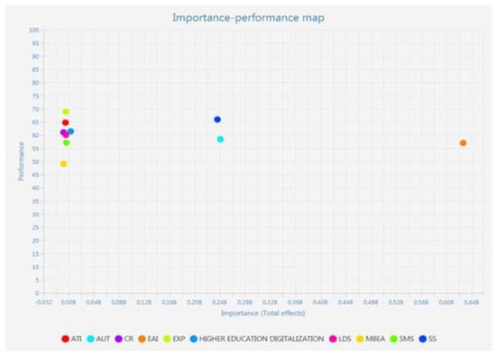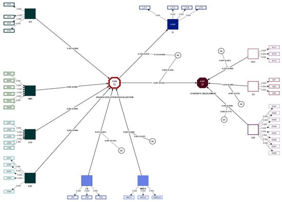 As the data from Table 1 show problematic AVE values for five variables (EQP = 0.369; EXP = 0.469; higher education digitalization = 0.236; LDS = 0.42; and SMS = 0.434), according to the literature criteria [], for the measurement of convergent validity, the composite reliability values must be used in order to determine whether the measured item has sufficient convergence. According to the rho_c values, all variables have sufficient convergence, except EQP, whose rho_c = 0.698 (<0.7); therefore, the latent variable must be removed.
