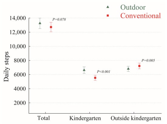 | Step counts outside kindergarten time | 6623 (1708) | 7185 (1704) | −562 | (−952; −171) | <0.01 |