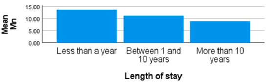 The highest mean concentration of Mn (12.97 ± 6.04 µg/L) from obese females in site 1 was significantly higher than other sites (p < 0.01). The second highest concentrations of Mn in obese female participants were recorded from site 2, with a mean and standard deviation of 11.41 µg/L and 4.35 and a range of 5.50–24.40 µg/L. The values recorded for Mn in the blood of some participants from all the sites were above the WHO recommended limit of 12.60 µg/L. There were significant differences in the concentrations of Mn from participants residing in site 1, site 2, and site 3 (p < 0.01). The lowest mean Mn concentrations in the participant’s blood were recorded from site 3. Although some participants live around site 3 for employment and study purposes, they frequently visit their homes which are either in sites 1 and 2, and these areas are associated with mining activities and other industrial activities. Due to the location of site 3 and nature of work of some participants in site 3, some are usually exposed to vehicular emissions on a daily basis, and the findings from this study should assist in having a basis for further research into the source of the Mn that was high in the blood of the participants in this area. The length of stay of obese females living around site 3 shows that individuals who lived in the area for more than 10 years recorded lower levels of blood Mn than those who have stayed in the area for less than 10 years (Figure 1). This suggests that those individuals may have been exposed to high levels of Mn in their previous residential areas [58]. The values of Mn recorded from site 1, an industrial area with active activities taking place from the industry situated opposite the informal settlement, are similar to those reported by Dey et al. [59], where the blood Mn from samples collected around a mining site exceeded the recommended limit. Their findings showed that Mn is considered a systemic toxicant that can damage multiple organs of humans. High levels of Mn may have adverse effect on the neurobehavioral attitude, as reported in the study by Pesch et al. [60]. The reports from other studies, such as Aguera et al. [61], showed mean values of 2.7 µg/L in females and 1.0 µg/L in males that are working as farmers and exposed to pesticides.
