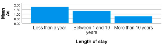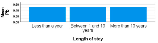 Blood Cd from this study recorded the lowest value of all the trace metals in the participants’ blood. The mean concentration of Cd in the blood was lower than the recommended limit of 1.12 µg/L from all the participants. However, higher than the recommended limit of Cd in blood were recorded from some females residing in site 3. The length of stay of obese females living around site 3 shows that individuals who lived in the area for more than 10 years recorded lower levels of blood Cd than those who had stayed in the area for less than 10 years (Figure 6). The length of stay shows that participants may have been exposed to high levels of Cd from other sources. The recorded concentrations for Cd were 0.38 ± 0.55 µg/L (0.01–2.28 µg/L) from site 3. There was no significant difference observed in the concentrations of blood Cd in participants from the sites in this study (p > 0.05). Though lower concentrations of As, Pb, and Cd (Table 1) were recorded in the blood of some participants, there is a need for close monitoring to reduce the effects of exposure on human health. High levels of Cd in the blood may affect the respiratory, renal, and skeletal systems. These high levels can lead to renal and tubular dysfunction and an increased risk of cardiovascular disease, peripheral arterial disease, heart failure, myocardial dysfunction, and stroke [73,74]. This study is similar to that conducted by [20], where they reported an increase in the concentrations of Pb, Mn, and Cd in the blood of participants exposed to trace metal pollutants. Furthermore, the study by Devoy et al. [75] also reported higher concentrations of mean blood Cd and Pb exceeding the permissible limits of 1.12 μg/L and 0.80 μg/L, set by WHO, respectively. Their findings further show that high levels of these metals can be attributed to several factors, such as smoking, place of residence, and intake of some food.