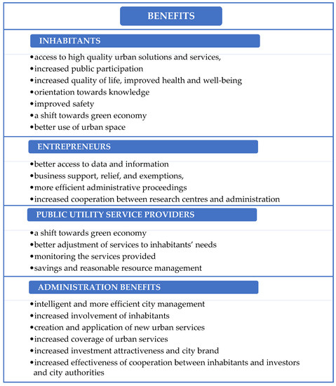 The designation of a smart, innovative city also entails an image-related aspect, as it raises the city’s prestige on the international stage and also reflects the satisfaction of inhabitants and entrepreneurs. Innovation opens up many opportunities for development and contributes to increased interest among investors. In this context, seen from the point of view of inhabitants and entrepreneurs, the innovation of a city includes, e.g., the position, modern technology in the infrastructure and transport, tax relief and exemptions, new job opportunities and positions, high wages, courses and training, upskilling, high education and scientific and research facilities, government subsidies and grants, and international cooperation [27]. Figure 1 shows the main benefits of having smart city status according to inhabitants, entrepreneurs, public utility service providers, and city authorities and leaders.