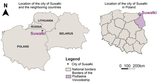 Suwałki is a city with poviat (county) rights, located in north-eastern Poland in the northern part of Podlaskie Voivodeship, as shown in Figure 2. The city is situated close to the border with three countries: Lithuania, Belarus, and Kaliningrad Oblast. According to Statistics Poland data, in 2021, the city with an area of 66 km2 was inhabited by 68,839 people, and the population density was 1051 people per km2, which makes Suwałki the second largest city in Podlaskie Voivodeship.