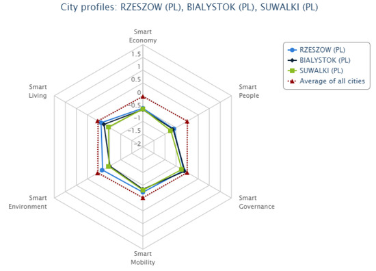 Figure 5 shows a comparison of three Polish cities, i.e., Rzeszów, Białystok, and Suwałki, due to the fact that these are located in Eastern Poland and covered by the Operational Programme—Development of Eastern Poland (a programme co-funded by EU funds). Based on the 2002 Eurostat study, the regions in which the cities being compared are located were found to have the lowest GDP per capita levels in the European Union.