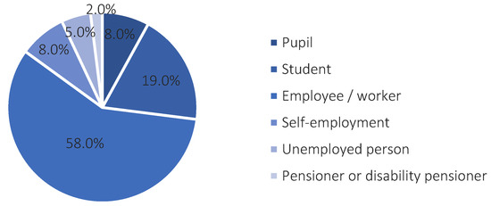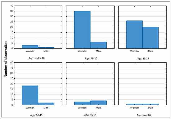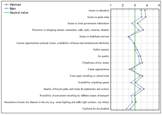 An online anonymous survey questionnaire was drawn up. The questionnaire contained 19 questions, including five questions making up the respondent’s particulars. The questions were open and closed. The questionnaire survey used the semantic differential method, i.e., a quantitative evaluation method developed by C.E. Osgood, G.J. Succi, and P.H. Tannenbaum in 1957 [47]. This is a method commonly applied in the field of sociological, psychological, and geographical sciences, which enables an assessment of a respondent’s impression of, or attitude towards, a phenomenon or an object. The analysis considered pairs of opposing properties defining aspects of the functioning of a city, smart city solutions introduced in the city, and the necessity for change. When compiling the results, each pair of opposing properties was regarded as a continuum comprising five members (from 5—strong positive indication to 1—strong negative indication). The questionnaire was uploaded to the mass media., i.e., to the public Facebook groups “SUWAŁKI—Information” and “Suwałki-ogłoszenia” and to the profile of the information portal “Suwałki.info”, which is among the major information portals of the city of Suwałki.