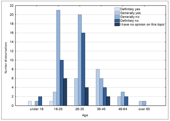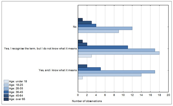 Assessment of the level of awareness of the smart city measures being taken by the city of Suwałki by age category. Source: own study based on questionnaire surveys.
