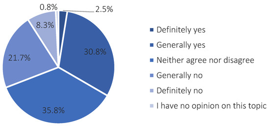 The vast majority of respondents (93.4%) answered “no” to the question “Are you concerned about the Smart City concept to be implemented in the city?”, of whom 59.2% were definitely not concerned about such solutions. Only 5% of respondents have concerns in this regard, while the others have no opinion. Therefore, inhabitants are very receptive to such solutions.