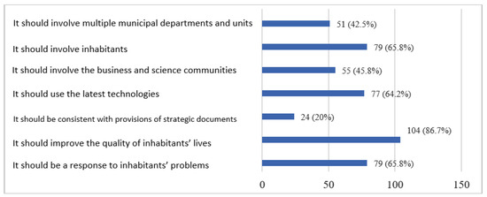 It is also important to encourage inhabitants to be involved in public participation initiatives, as this will have a positive impact on urban space management and, thus, on the level of city dwellers’ satisfaction. Failure to participate and be involved in local matters results in a feeling of separateness and belonging to no community and a low level of shared responsibility for the city’s affairs. Participation is the informed involvement of citizens in matters that are important to them, through which they gain influence (and some degree of control) over the authorities’ actions. As regards the criteria that a smart city project should meet, among the most frequent responses were those stating that the effect of its implementation should be improved quality of life and that the projects should respond to inhabitants’ needs. City administrators should also consider an effective solution for informing inhabitants about the smart solutions and services in place in the city. The awareness of the local community about these solutions is low, but the goal is to increase their utilization. Inhabitants are not always fully aware of the benefits brought by the solutions introduced, which decreases interest in the smart city concept, and thus the authorities receive no feedback on the need for further solutions to improve the city space. The city authorities should therefore focus on better informing inhabitants of their activities using a variety of communication channels to reach all inhabitants.