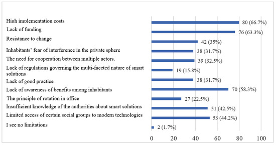 Since the smart city concept has certain limitations in its implementation, the respondents were asked to identify the barriers they believed were major. The respondents indicated high implementation costs and lack of funding as the main barriers. They also considered that the inhabitants are not fully aware of the benefits brought by the introduced solutions, which makes the interest in the smart city concept low, and thus the authorities receive no information on the need to improve the city space (Figure 17).