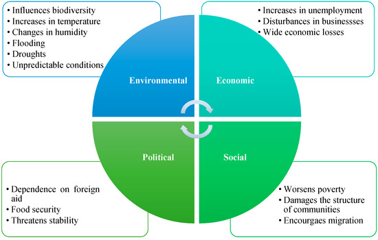 Climate change is defined as an imbalance in the usual climatic conditions such as temperature, wind patterns, and precipitation, which characterize each region on Earth. Climate change, according to the Intergovernmental Panel on Climate Change [], is defined as detectable changes in the climate, based on statistical analysis, and lasts for decades or even more, whether caused by natural oscillation or as a consequence of human activities. The frequency and magnitude of long-term global climatic changes will have massive consequences for natural vital systems. Increasing temperatures will also lead to a change in weather types such as wind patterns and the amount and types of precipitation, in addition to the occurrence of several potential extreme weather events. This will lead to wide-ranging and unpredictable environmental, social, and economic consequences []. In a recent revelation, the National Aeronautics and Space Administration (NASA) stated that the continual shift occurring in the climate was having an impact on the ecosystem and was paving the way for a new geologic age, which some refer to as the Anthropocene, in which the climate will be substantially different from the one our forefathers knew [].