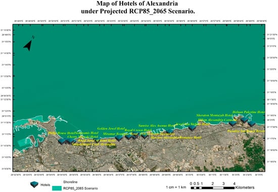 Coastal hotels in Alexandria under the projected SLR scenario of RCP8.5 until the year 2065.