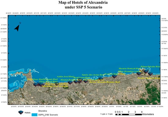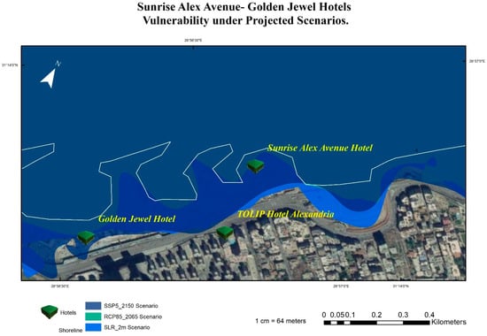 According to the results, the most vulnerable hotels under the four SLR scenarios are the Sunrise Alex Avenue Hotel, Helnan Palestine Hotel, Golden Jewel Hotel, Sheraton Montazah Hotel, Mercure Alexandria Romance Hotel, and Paradise Inn Beach Resort. As shown in Figure 8 and Figure 9, the map shows the vulnerability of these hotels under different SLR scenarios.
