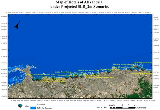 Coastal hotels in Alexandria under the projected SLR 2m scenario.