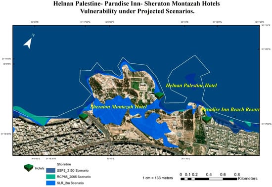 The vulnerability of the Helnan Palestine, Paradise Inn, and Sheraton Montazah hotels under the four projected SLR scenarios.
