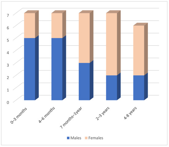 Medical records were about 34 patients, 17 males and 17 females, hospitalized from July 2017 to August 2022; the average age was 23 months, ranging from 1 month to 8 years (Figure 1).