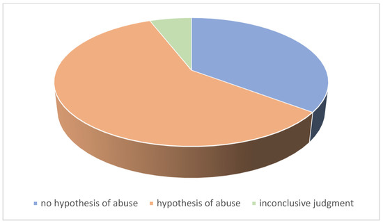 From the analysis of each medical record, the following elements were identified: age; sex; circumstantial and anamnestic elements useful for the purposes of abuse compatibility; motivation for emergency observation; objective clinical findings in the emergency room; outcome of laboratory investigations and specialist consultations carried out during hospitalization; findings from diagnostic imaging investigations; behavior and psychological status of the child, additional findings from medico-legal observation and timing of its execution; conclusions about the compatibility of the lesions; and final orientation on hypothesis of maltreatment.