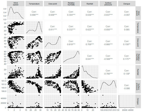 Correlations between meteorological parameters and Dengue cases are presented in Figure 2. This graph suggests that none of the associations are statistically significant. However, Spearman’s rank correlation coefficients between meteorological variables and confirmed daily Dengue cases indicate a meaningful but weak relationship between Dengue cases and climatic parameters (Figure 2). Concerning daily Dengue cases, the mean temperature and wind speed show a weakly negative link (r = −0.007, p > 0.05 and r = 0.085, p > 0.05, respectively). However, there is a significant positive correlation among dew point, relative humidity, and rainfall with daily Dengue cases (r = 0.158, p < 0.05, r = 0.175, p < 0.05, and r = 0.138. p < 0.05), respectively. On the contrary, surface pressure exhibits an insignificant negative correlation with daily Dengue cases (r = −0.086, p > 0.05) (Figure 2).