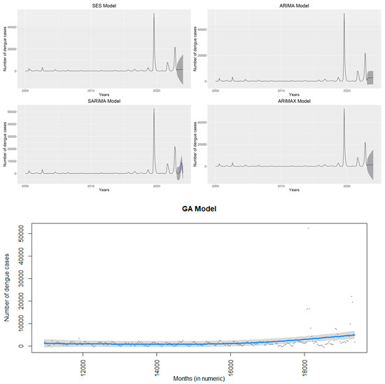 Dengue with AIC, AICc, and BIC of 5232.86, 5233.01, and 5247.34 for the ARIMA model, compared with 5088.54, 5088.77, and 5106.44 for the SARIMA model, and 5238.35, 5239.18, and 5274.56 for the ARIMAX model, we detected a strong, growing trend between observed and predictive Dengue cases. However, the GA model performs weakly (i.e., AIC = 5358.541, AICc = 5358.870, and BIC = 5396.837). All models, except for SES, forecast a considerable increase in cases of Dengue over the following 30 days (Figure 3).