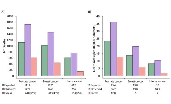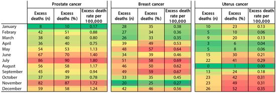 3.1. Excess Deaths and Excess Death Rates by Cancer Type