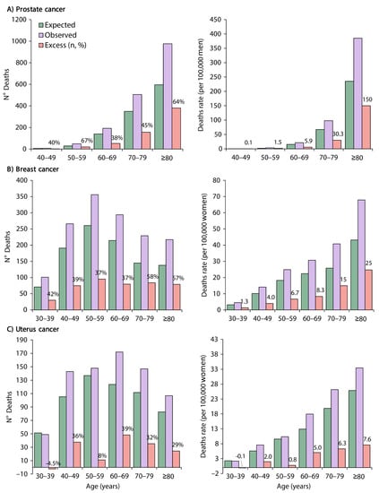 3.2. Excess Deaths and Excess Death Rates by Cancer Type and Age
