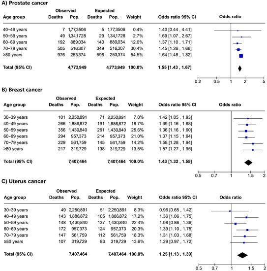 3.3. ORs for Observed Deaths vs. Expected Deaths by Cancer Type and Age
