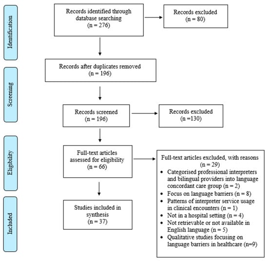 The initial database search of papers published between 1996 and 2020 yielded 276 articles (Figure 1). After the removal of duplicates, 196 articles remained for title and abstract screening. Two reviewers independently screened the titles and abstracts which excluded 130 articles for not meeting the inclusion criteria. Sixty-six papers remained for the full-text screening, and we excluded twenty-nine papers for not meeting the inclusion criteria. Qualitative studies were excluded from this review as they focus on patient encounters with language barriers in healthcare. In total, 37 papers were selected and included in the review for quality assessment and data analysis.