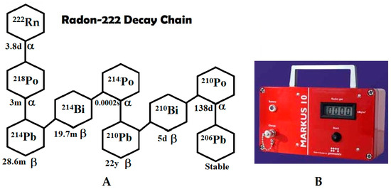 (A) Radon decay chain. Gaseous 222Rn decays with a half-life of 3.8 d into 218Po, which decays by alpha emission in three minutes [17]. (B) Gammadata’s Markus 10 instrument used to measure the radon concentration in soil.