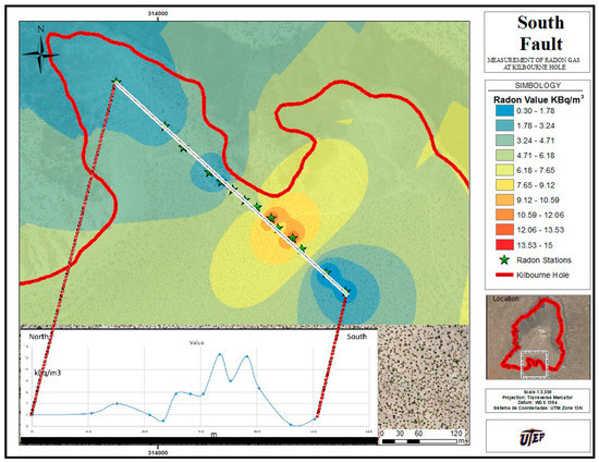 Likewise, the study of the south fault (c.f. Figure 4) clearly shows an increase in the radon concentration near the fault. Indeed, Figure 4 shows that the radon levels rise markedly by a factor of 10 at some TPs along the existing fault location. This confirms the observations of Rodríguez and López [5,6], which indicated that the concentration of underground radon gas increases near geological faults. Furthermore, the high levels of Rn found at the northeast rim of the crater could indicate the existence of an undetected fault.