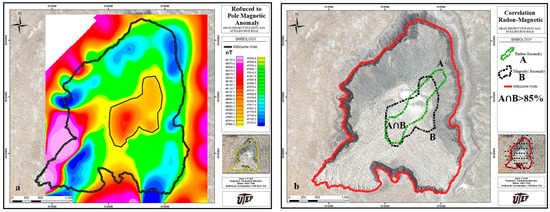 (a) RTP magnetic map of Kilbourne Hole, with black line delimiting the magnetic anomaly, from Maksim (2016). (b) CRn and magnetic field anomaly show the overlapping regions (>85%).