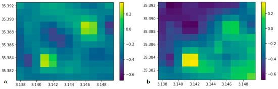 (a) Colored map to evidence differences between magnetic and the CRn values; (b) similarly for the gravity and the CRn values. The map abscissa is the latitude, and the ordinate is the longitude. Numbers near the column indicate the degree of similarity (lowest: 0.4; highest: −0.6).
