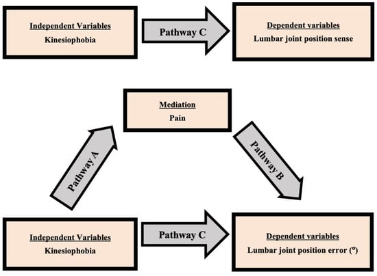 The Shapiro–Wilk test was used to assess the normality of the study variables, and the data followed a normal distribution. The relationship between the TSK score (kinesiophobia) and LJPS was estimated using Pearson’s correlation coefficient. ANOVA was used to compare LJPS between the CLBP group and the asymptomatic group. Mediation analysis was computed to assess the impact of pain on the relationship between kinesiophobia and LJPS in CLBP individuals. The mediation analysis included a three-step process (Figure 2).