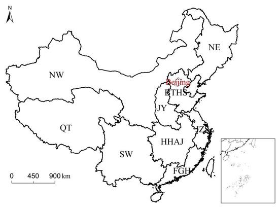 Study area. (NE: Northeast Region, JY: Jin Yu Region, BTH: Beijing Tianjin Hebei Region, FGH: Fujian Guangdong Hainan Region, JZS: Jiangsu Zhejiang Shanghai Region, NW: Northwest Region, SW: Southwest Region, HHAJ: Hunan Hubei Anhui and Jiangxi Region, and QT: Qinghai Tibet Region).