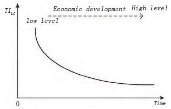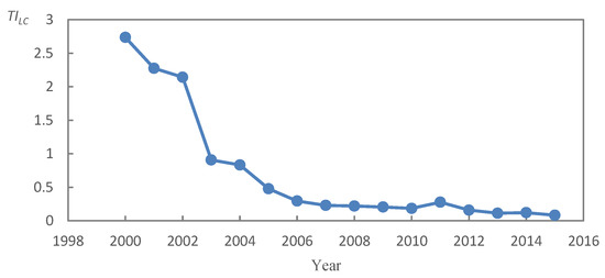 The land consolidation structure index (TILC) decreased from 2.74 in 2000 to 0.08 in 2015, with an average annual decrease of 0.18 (Figure 5). Among them, from 2.14 to 0.91 in 2002–2003, the decline was the biggest, and it was the turning point where the scale proportion of land arrangement projects exceeded land development. In 2005, the index was below 0.5, and then the downward trend gradually stabilized. This showed that the land consolidation structure in China has been changing from stable to drastic. Since 2003, the dominant role of land development was replaced by land arrangement, and the proportion of land arrangement is still increasing. With the decrease of reserve land resources, land development activities of unused land were gradually replaced by land arrangement of excavating stock. It was not only improvement of the utilization efficiency of land resources, but also reduction of the development intensity to a certain extent and protection of the ecological environment.