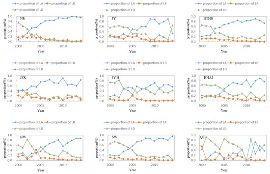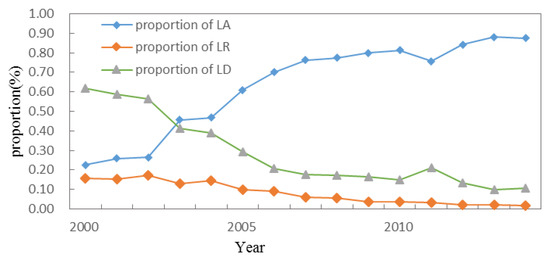 The structure change of LC in 2000–2014 in China (LA: land arrangement, LR: land reclamation, LD: land development).