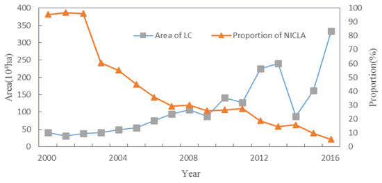 The change trend of LC area and NICLA proportion in China in 2000–2016. (LC: land consolidation, NICLA: newly increased cultivated land area; proportion of NICLA = NICLA/area of LC.).