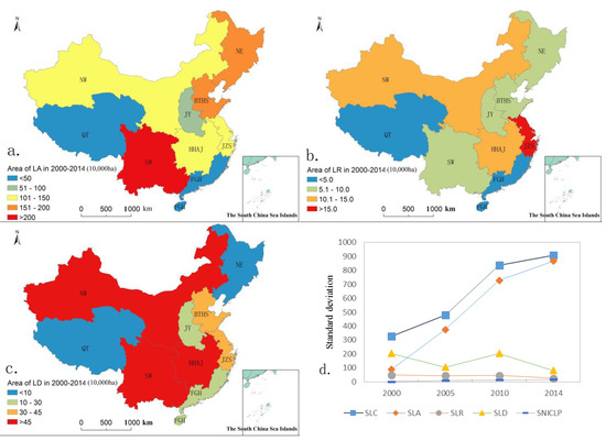 Geographic distribution of area of LA, LR, and LD in China in 2000–2014 and standard deviation in nine regions in 2000, 2005, 2010, and 2014 (Subfigures (a–c) is the geographic distribution of area of LA, LR, LD in China in 2000–2014, respectively; subfigure (d) is the geographic distribution of standard deviation of SLC, SLA, SLR, SLD, SNICLP in China in 2000–2014. SLC: standard deviation of land consolidation area, SLA: standard deviation of land arrangement area, SLR: standard deviation of land reclamation area, SLD: standard deviation of land development area, SNICLP: standard deviation of newly increased cultivated land proportion.).