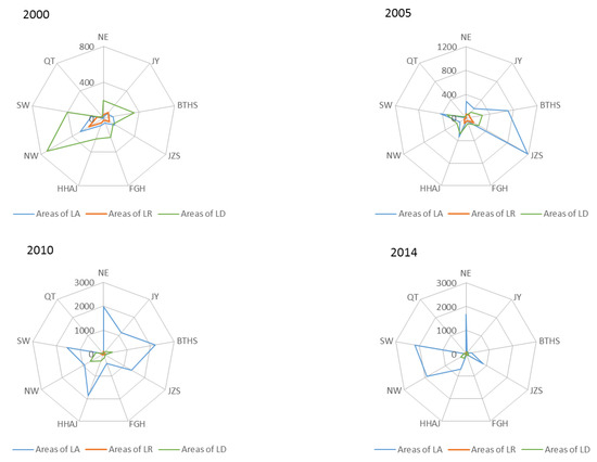 Figure 7 presents the scale structure of land consolidation in four periods during the years 2000–2014 in each region of China. It can be seen that the spatial distribution of the three types changed from being concentrated in one area to dispersed in three areas, gradually reflecting the difference of distribution and the spatial orientation of the various types of land consolidation: that is, the land development concentrated in the NW with large land area and relatively backward economic development, and the land arrangement and land reclamation relatively concentrated upon the JZS and BTHS with small land area and relatively developed economy.