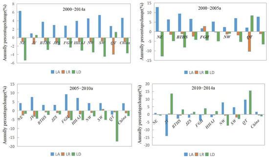 Annual percentage change in LA, LR, LD in each region of China in the periods of 2000–2014, 2000–2005, 2005–2010, and 2010–2014. (LA: land arrangement, LR: land reclamation, LD: land development, NE: Northeast Region, JY: Jin Yu Region, BTH: Beijing Tianjin Hebei Region, FGH: Fujian Guangdong Hainan Region, JZS: Jiangsu Zhejiang Shanghai Region, NW: Northwest Region, SW: Southwest Region, HHAJ: Hunan Hubei Anhui and Jiangxi Region, and QT: Qinghai Tibet Region).