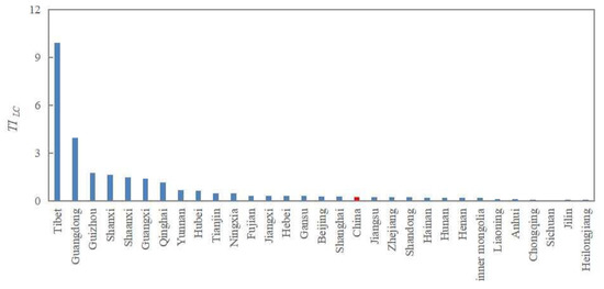 Provincial distribution of TILC in China (× 100%, TILC, structural change index for land consolidation; , land arrangement area; , land development area).