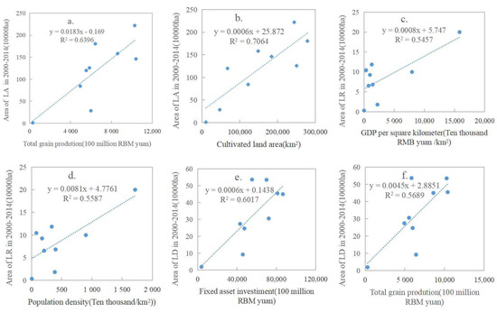 Scatter map of area of regional LA (a,b), LR (c,d), LD (e,f) and typical socio-economic and geographical indicators.